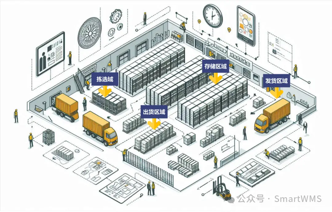 这里有一个核心原则叫做“动静分离”。我们将仓库大致划分为“静区”和“动区”。静区主要用于长期存储周转不快的商品,而动区则是发货流程中最活跃的心脏地带,包含了收货、拣货、打包、复核、发货等关键环节。将这两个区域清晰划分,能有效减少不必要的干扰和搬运,让作业效率大幅提升。