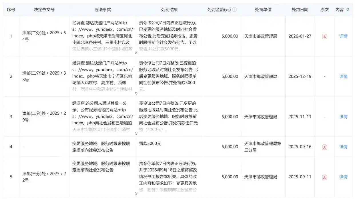 变更派送范围未公示致快件滞留 天津韵必达快递被罚5000元